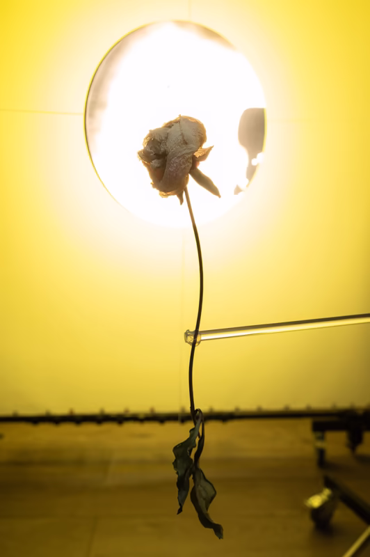 The idea of the image is to communicate the sensation of heat in the language of still life photography. There are only two elements present: a flower wilted by unbearable heat and the hot sun that fills everything with its dominant presence. There remains no room for anything else—everything would be burned down should it dare to enter the frame.